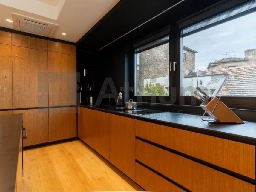 Vrhunski dizajn enterijera stana proizilazi iz posvećenosti završnim materijalima u svakom segmentu prostora kao i detaljima koji izražavaju neverovatnu jednostavnost i eleganciju. Kuhinja je potpuno opremljena, zidne obloge izrađene su od furniranog drveta, dok su svi tehnički uređaji od renomiranih proizvođača.
