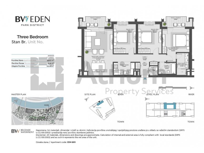 Na prodaju je ekskluzivan četvorosoban stan površine 111 m², smešten na 8. spratu moderne zgrade BW Eden u kompleksu Beograd na vodi.