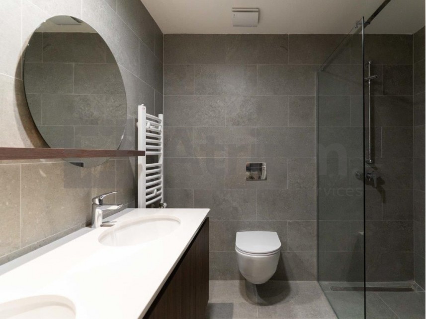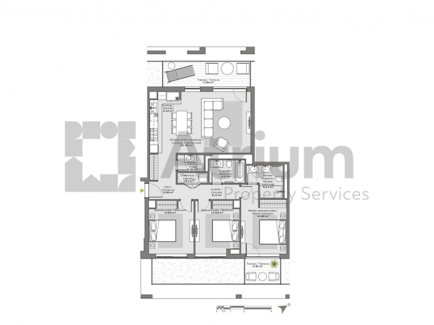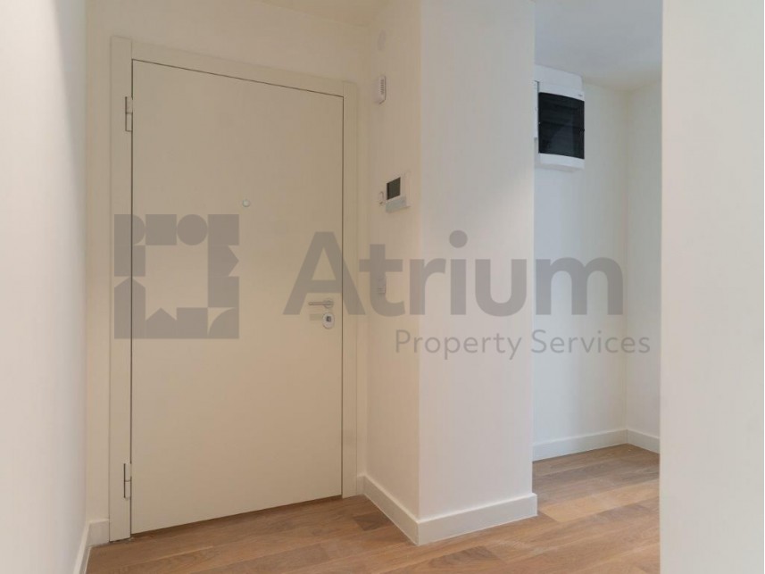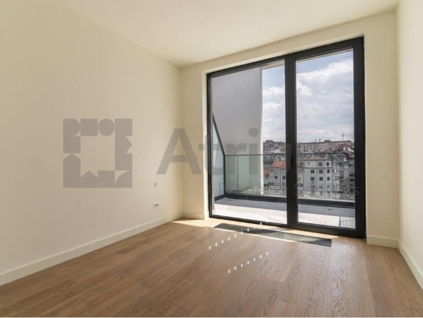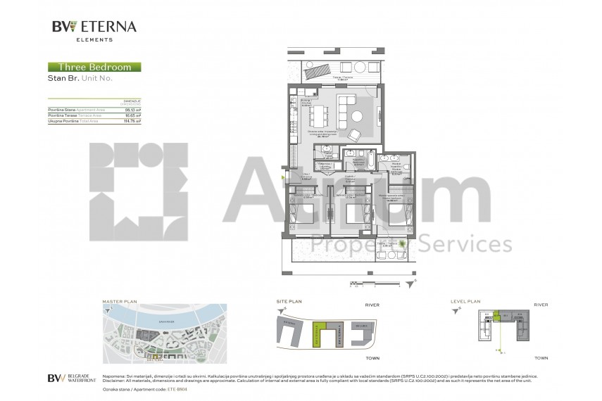 Stan se sastoji od prostranog dnevnog boravka sa kuhinjom i trpezarijom iz koje se izlazi osunčanu terasu koja gleda direktno na park i sa koje se čak vidi reka. Ima tri spavaće sobe orijentisane ka unutrašnejm dvorištu (svaka sa svojom terasom), dva kupatila, gostinjski toalet i vešernicu. Kvalitetni završni radovi I luksuzni materijali čine ovaj stan dodatno privlačnim.