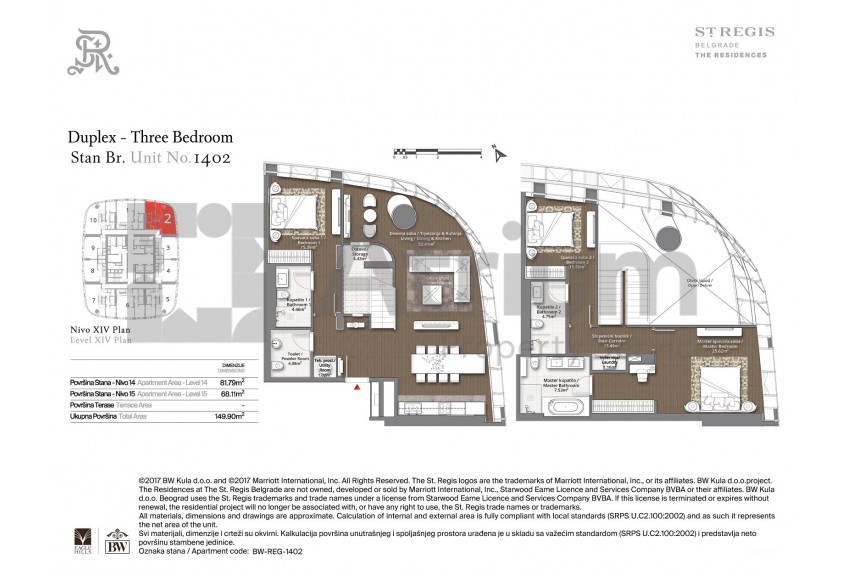 Content by levels is: Level 1 - Hotel Entrance and Branded Residences, Ballroom, Level 2 - Swimming Pool, Gym, Training Room, SPA, Meeting Rooms, Levels 3 - 11 (119 Hotel Rooms). Regis hotel, level 14 - 19. (32 apartments) - “Signature” collection, level 20 - 37 - (170 apartments) - “Grand” collection, level 37 - 40 - (Top of the building - 18 apartments) - “Sky” collection , level 40 - Restaurant, level 41 - Lookout